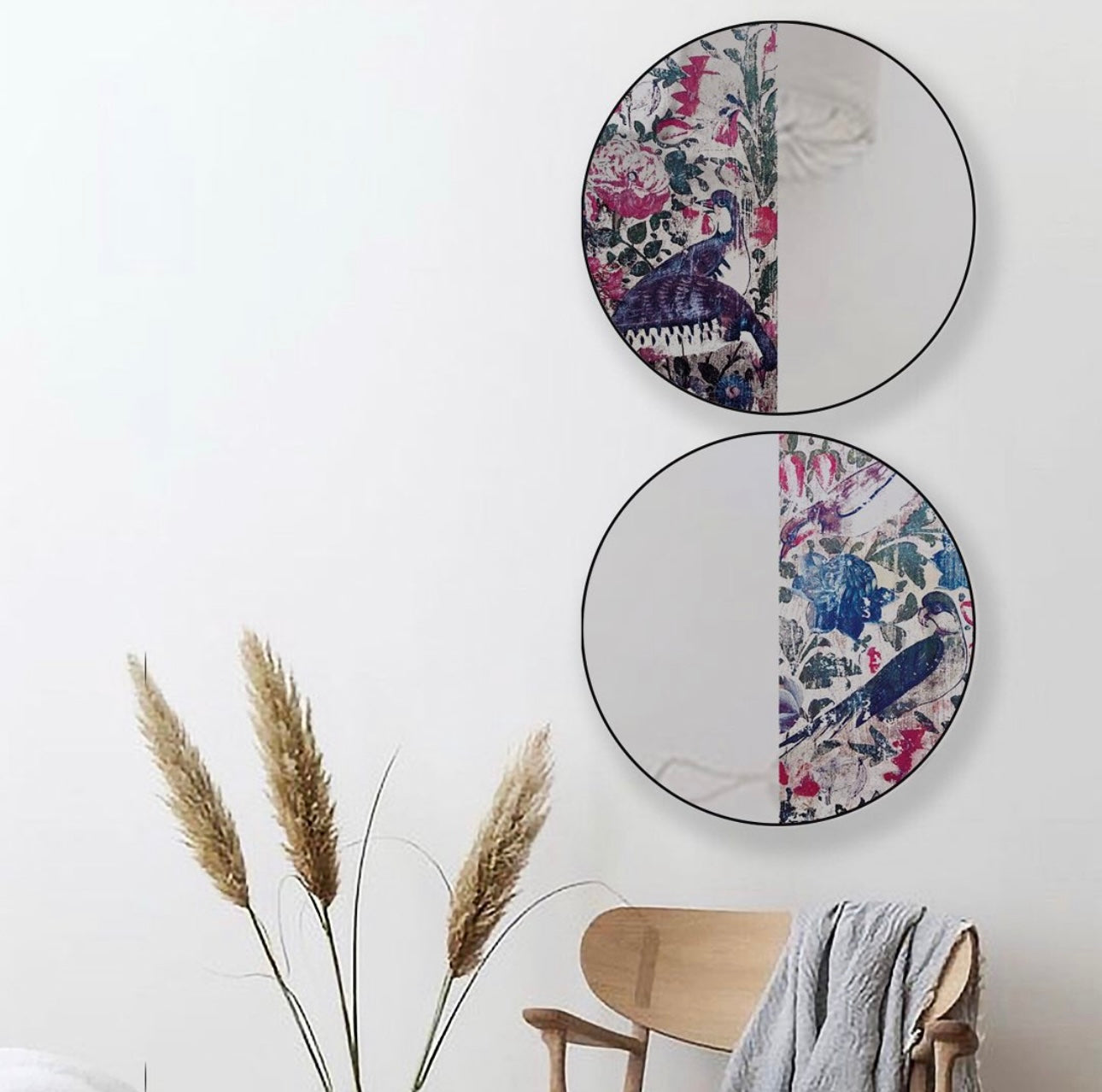 Introducing our Enchanting Round Mirror with a Touch of Nature, where beauty meets functionality in a captivating display. This unique mirror features a perfectly symmetrical design, with one half adorned with a meticulously painted traditional bird and tree motif.